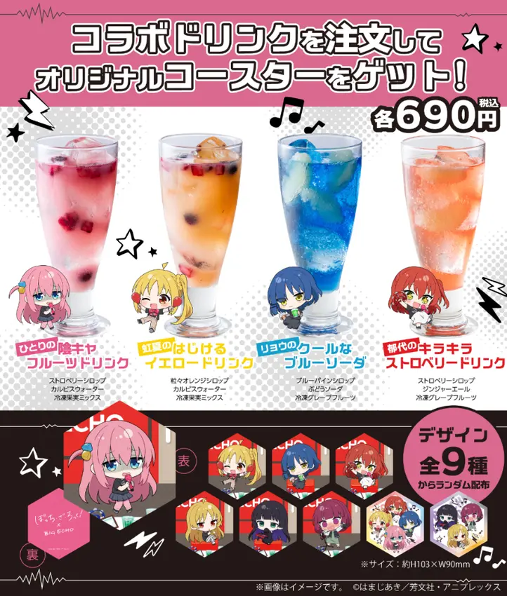 在飲品方面,全日本80家門市會推出四款以團結樂團成員為主題的無酒精飲料。包括以主角為設計的孤獨內向水果飲,虹夏的歡騰黃飲,良的藍蘇打,以及郁代的草莓飲。每杯售價690日圓,購買就送一個隨機的原創杯墊,杯墊共有九款圖案。若贈品庫存用盡,店家可能暫停販售聯名飲品。建議粉絲們盡早預約包廂!東京可能競爭激烈,如果還沒買機票也可以考慮非關西喔!![]()
