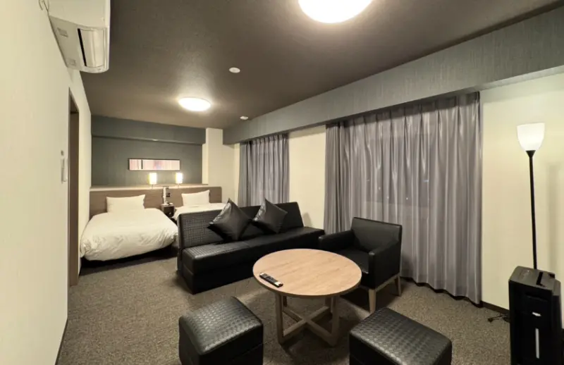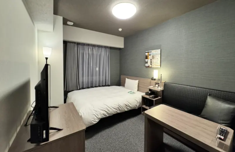 這家12層樓的飯店共有230間客房,可容納324人。單人房面積在13.7至15.8平方公尺之間,每間房都配備42吋液晶電視和具加濕功能的空氣清淨機。房內提供WiFi服務,並設有隨選電影系統(每晚1000日圓)。衛浴設備包括溫水免治馬桶和一體式浴室。房內配有冰箱、電話、煮水壺和馬克杯。盥洗備品十分齊全,包括洗面乳、化妝水、乳液、沐浴巾、護髮組、沐浴乳、牙刷、梳子、刮鬍刀和棉花棒。房內也準備了浴巾、毛巾、浴室踏墊、鞋拔、拖鞋、衣架和吹風機。飲品方面提供綠茶和紅茶茶包。每個房間還附有日式浴衣,讓住客在房內也能感受日式住宿氛圍。![]()