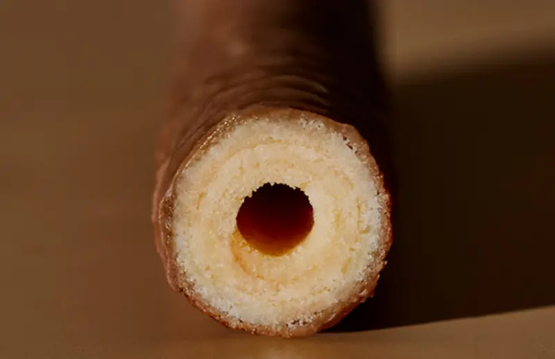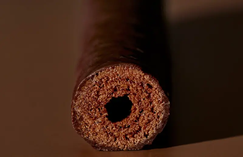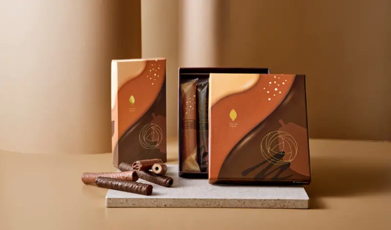 新版「巧克力雪茄捲」保留原有製作工序。餅皮先捲成圓筒,再包覆巧克力。黑巧克力口味款選用61%可可含量巧克力,加上可可粉餅皮,呈現雙重可可風味。價格為含稅1,404日圓,內容物為濃郁牛奶位2入、濃郁黑巧克力味2入。![]()