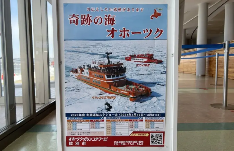 為了親眼見證這一冬季奇景,我們一行人提前三個月便在官網預訂了船票,並在當日提前一小時抵達紋別的紋別海洋交流館(Galinco Station),這是紋別破冰船的燈船碼頭,內部設施完善,工作人員使用流利英語為我們辦理了報到手續,然而,在交談中,他遺憾地告知我們:「今天外海幾乎沒有流冰,而已付款的船票無法退款。」這番話讓我們的期待瞬間降溫,原本激動的心情似乎被寒冷的空氣更添了一層冰霜。![]()