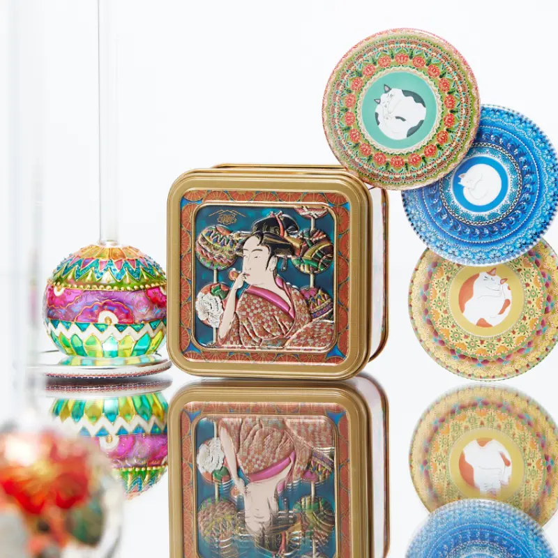每個禮盒都附贈一面獨特的小鏡子,由創意設計師Michiru設計,鏡面繪有慵懶躺在和風坐墊上的貓咪圖案,充滿懷舊氛圍。