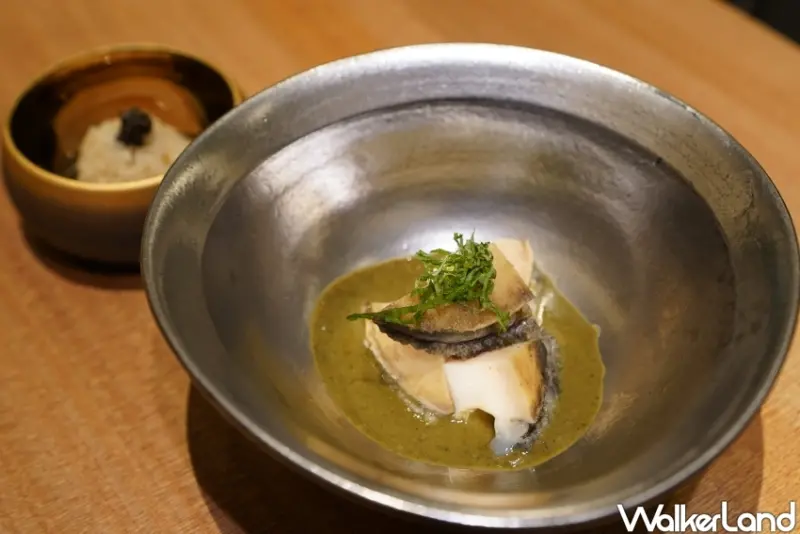 ▲高雄日航酒店飛翔餐廳的酒蒸鮑魚佐鮑魚肝醬/ WalkerLand窩客島 楊婷雅 拍攝