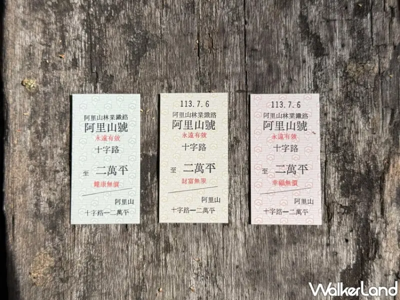 除了蒸汽列車賞櫻行程外,林鐵及文資處也同步推出極具收藏價值的「十二萬分祝福」紀念車票。這組紀念車票象徵113年42號隧道完工後,林鐵行經十字路至二萬平的全新路線。十字路是林業鐵路與部落古道的交會點,而二萬平則是台灣少數能夠一覽壯闊雲海的高山站點,為鐵道迷帶來前所未有的珍貴旅程。紀念套票共分為三款,分別象徵「十二萬分幸福」「十二萬分財富」及「十二萬分健康」,每一張皆為手工精心印製,極具收藏價值,預計將成為鐵道迷與遊客爭相收藏的熱門單品。