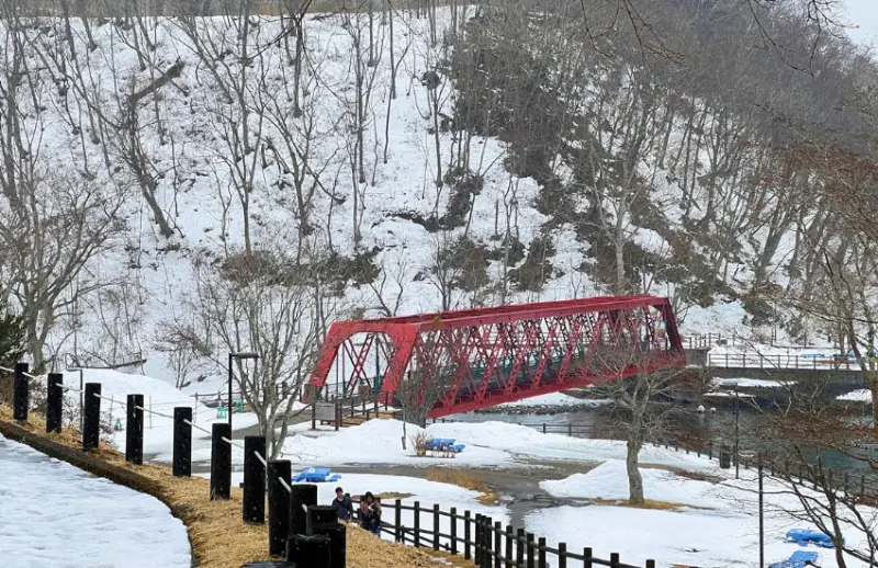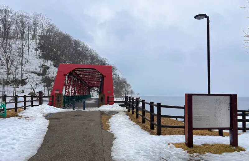 紅色的山線鐵橋,橫跨於湖邊,是北海道明治時期開拓時的歷史遺跡,承載著昔日運輸木材的記憶軌跡,如今,紅色鐵橋已停止使用,成為一處攝影勝地,特別是冬季時,紅橋覆蓋白雪,與湖面倒影交相輝映,猶如一幅活靈活現的水墨畫。![]()