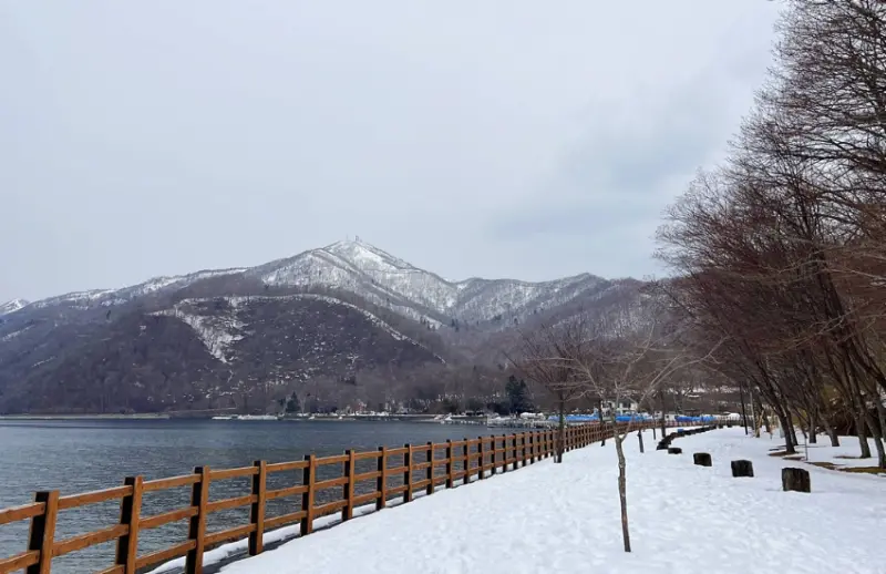 支笏湖湖畔園地是一片緊鄰湖水的開放空間,木棧道、觀景平台、露天長椅,以及完全被白雪覆蓋的湖畔草坪。多數人通常對支笏湖的認識,來自冬季湖面不結冰、不結凍與湖水極度清澈的特性,我向前一看,湖水確實清澈得驚人,就連湖底的圓潤石頭,都能一顆顆清楚描繪它的色調與形狀,湖面則映照周圍的惠庭岳與樽前山,湖心毫無波瀾,四周圍安靜得彷彿時間都停止了流動,有一些不怕冷的人,正在慢悠悠地散布著,靜靜感受湖面的微風。![]()