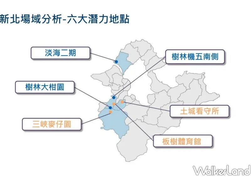 ▲新北大巨蛋6大潛力選址,包括土城看守所、淡海二期等地 / 新北市政府城鄉發展局 提供、WalkerLand窩客島整理