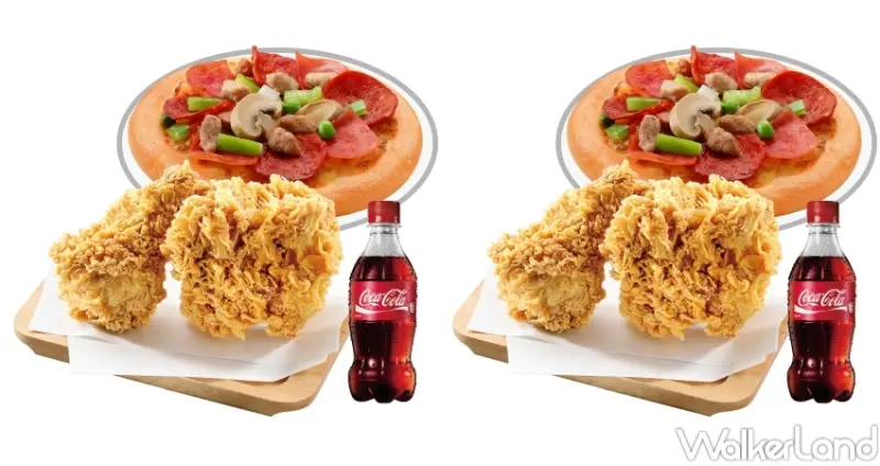Mini 披薩 + 兩塊炸雞 + 迷你瓶飲料,兩套優惠價343元。使用街口支付結帳加碼再享5%街口幣回饋。