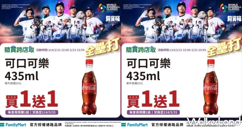全家為了幫中華隊加油、為台灣隊集氣搶首勝,特別在2月21日22:00至2月22日期間,推出435ml可口可樂買1送1的限時優惠。讓球迷不僅能在觀賽時可以享受清涼暢快的可樂,更能與全家一起挺Team Taiwan搶首勝。同時,全家應援優惠還有FamiCollection指定茶飲買2送1,百吉棒棒冰買2送1。![]()