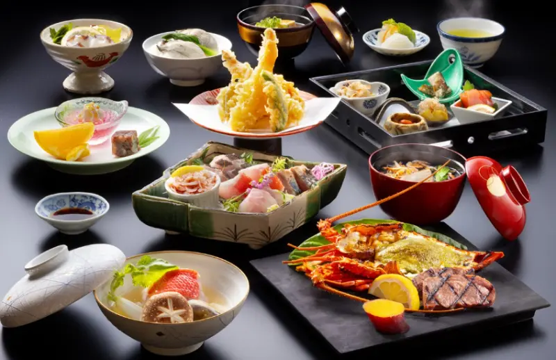 飯店的餐廳:「膳處彩」供應早晚餐,營業時間為17:30至21:30與7:00至9:30。晚餐提供金目鯛、伊勢龍蝦等當地海鮮,以會席料理方式呈現,以「北川浪漫」套餐來說的話,包含:五品當季前菜、櫻花蝦清湯、五品生魚片、伊勢龍蝦與牛肉、金目鯛燉煮、無限供應天婦羅、三式醋物、蟹肉雜炊與當季甜點。保證你能吃得很飽!早餐則提供炭火烤乾物、日式蛋捲等在地食材。用餐時可觀賞日出或月光的景色。![]()