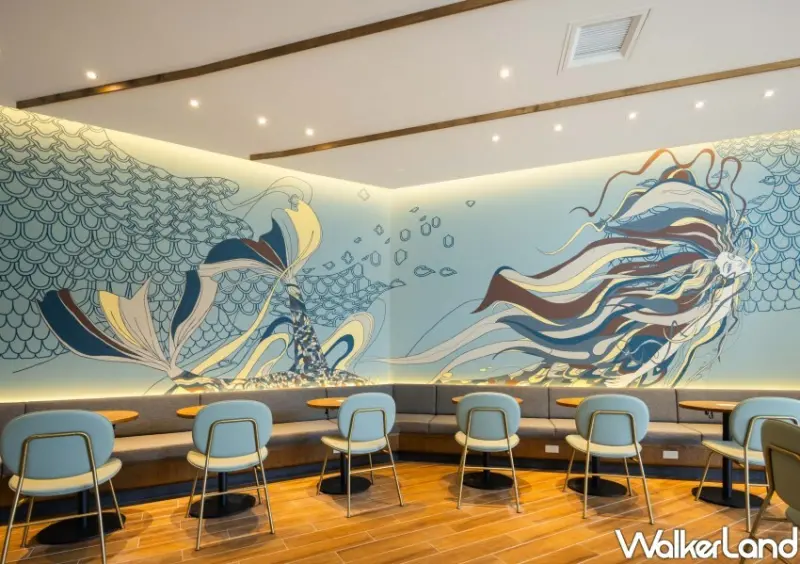 ▲星巴克萬里門市店內以海洋為主題,Siren女神在海洋中自在悠遊的畫面 / 星巴克 提供、WalkerLand窩客島整理