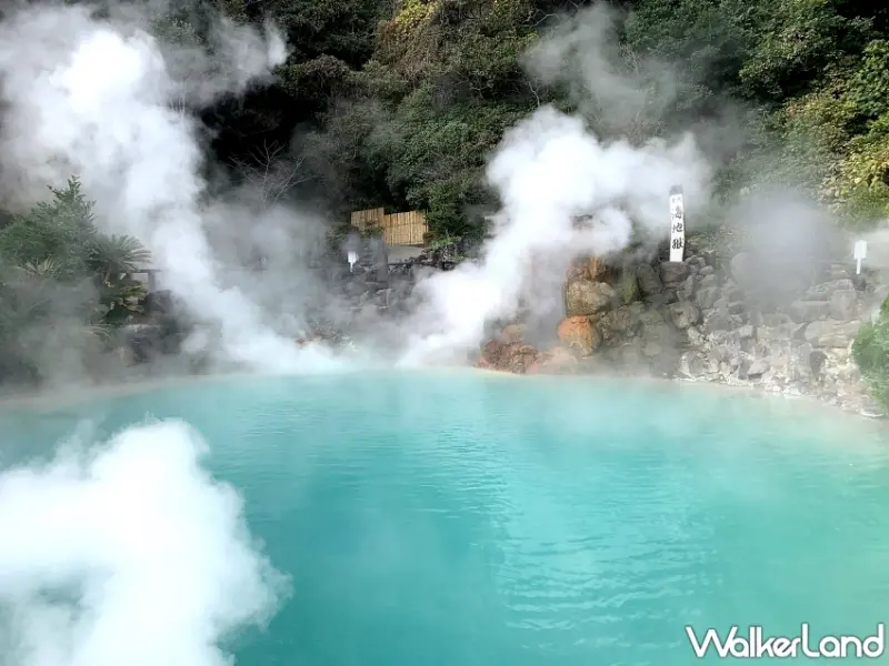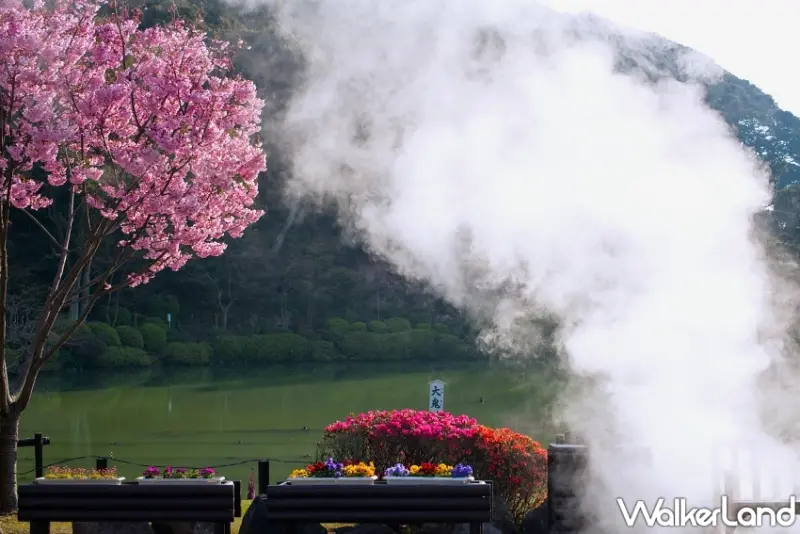 ▲鄰近的「海地獄」更是春季不可錯過的景點。這座以碧藍溫泉聞名的地獄溫泉,每年春天都會迎來染井吉野櫻盛開的夢幻時刻 / 地獄溫泉博物館提供、WalkerLand窩客島整理