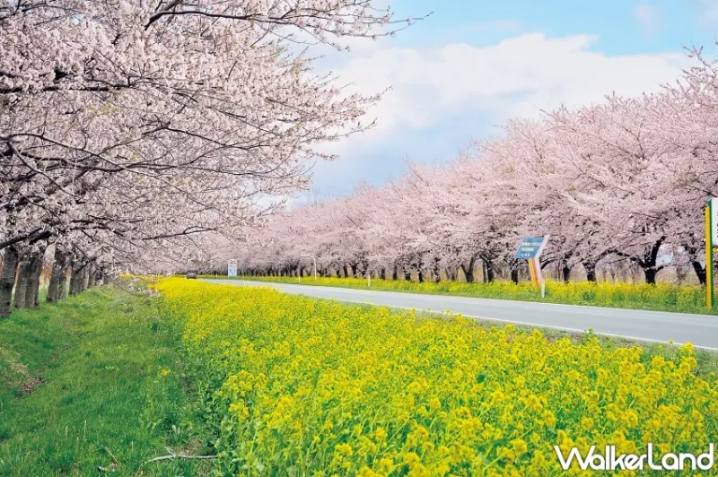 ▲有一條長達11公里的「櫻花與油菜花之路」,兩側種滿約4,000棵櫻花樹與金黃燦爛的油菜花 / 照片出處:Akita Fun提供、WalkerLand窩客島整理