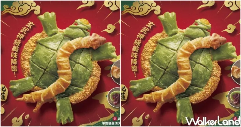 去年必勝客推出的「草仔龜比薩」和「芝心蛇圈圈」引爆討論,今年必勝客應粉絲要求,讓兩者「蛇」進合體,變身靈獸「玄武」,不僅造型超吸睛,更蘊含長壽與祝福的寓意。其中,「芝心酥皮蛇」裹上金黃酥皮,搭配濃郁莫札瑞拉芝心,打造外酥、內牽絲的口感。「草仔龜」一次能吃到鹹甜兩種風味,一半鹹口味內餡是大火爆香的蝦米搭配菜脯米,散發濃濃古早味,另一半甜口味則使用萬丹紅豆,搭配Q彈艾草粿皮,讓人鹹甜口味一次滿足。![]()