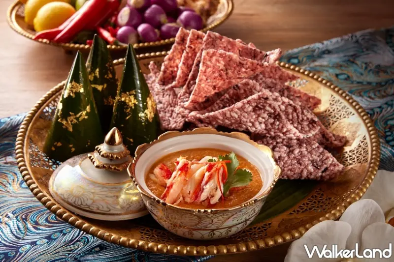 ▲「香酥米餅佐帝王蟹明蝦沾醬」,這道經典泰式小吃採用紫米製成的香脆米餅,搭配主廚特製的濃郁海鮮醬 / 台北喜來登提供、WalkerLand窩客島整理