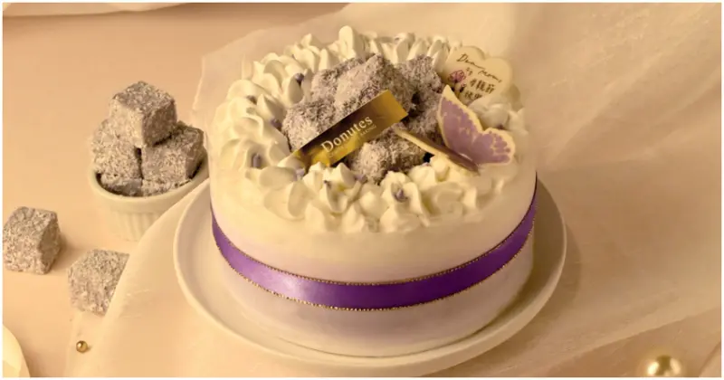 繁複美麗的鮮奶油擠花,搭配一隻優雅的淺紫色蝴蝶,夢幻的紫芋蛋糕,是多那之經典的芋頭布丁口味,素食者也能安心享用。