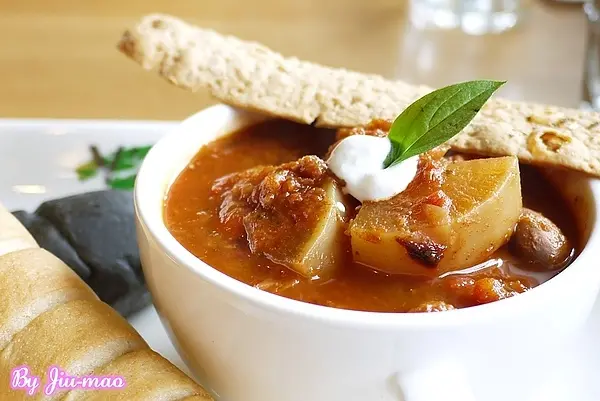 濃郁的番茄湯,酸度比較高一點,但很順口,搭著麵包,非常好吃。