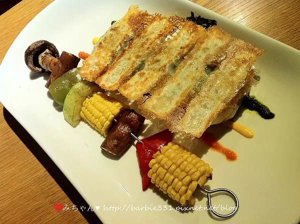 5顆斗大又酥脆的煎餃搭配鮮蔬串燒華麗的呈現