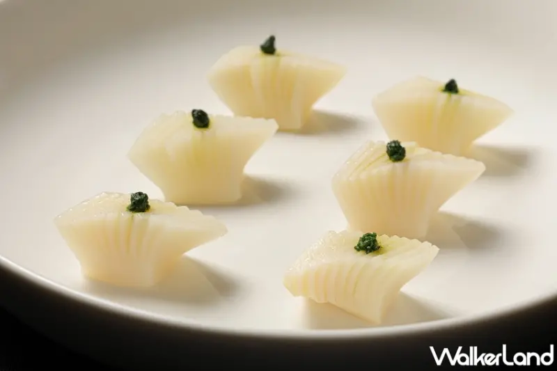 ▲「梳片春筍」將當令綠竹筍與糯米同煮,切片後點綴以香椿芽、菠菜與麻油調製的醬汁 / 台北晶華酒店晶華軒提供、WalkerLand窩客島整理