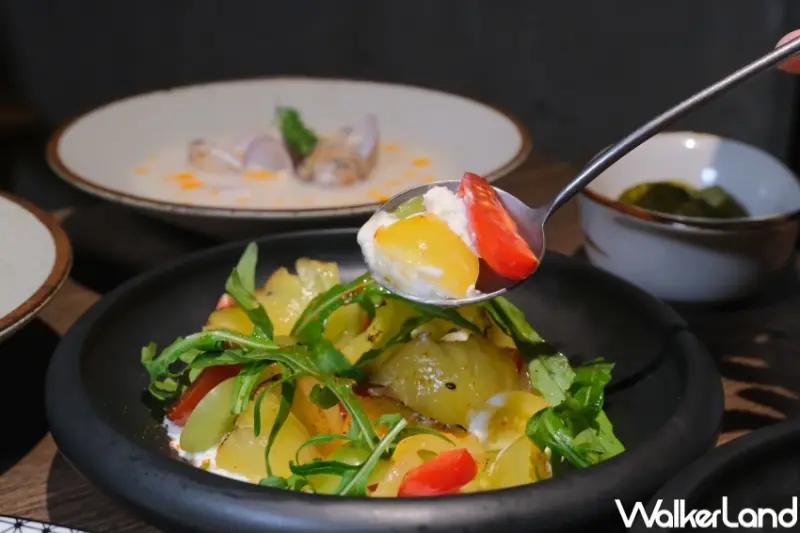 ▲吾居炭火餐酒主打全新9種醬料,新菜單冷菜推薦必吃繽紛番茄起司芝麻葉沙拉 / WalkerLand窩客島 張人尹 拍攝