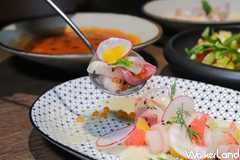 ▲吾居炭火餐酒除了全新9種醬料,新菜單推薦必吃稻燻生青甘佐虎奶醬汁 / WalkerLand窩客島 張人尹 拍攝