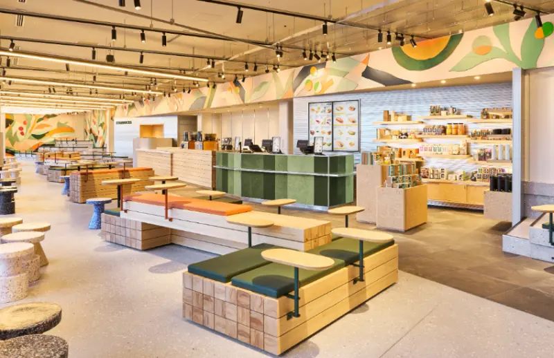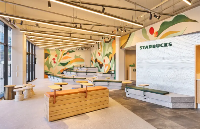 店內還設有專屬藝術裝置,描繪咖啡農場景象、農場動物和豐富自然環境,從主入口延伸至店內深處,環繞整個空間,講述整篇故事。藝術作品中還融入了大阪元素,用各種方式表達與當地的連結。當你下次造訪大阪,不妨前往這家融合環保理念、關西惜物精神和舒適空間的特色星巴克!
