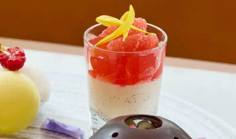 入口即化的奶酪凍上疊著血橙果凍,頂部也豪華地裝飾著多汁清新的粉紅葡萄柚,一看就令人口水直流。奶酪凍的溫柔甜味、血橙的清爽酸味,以及葡萄柚的微苦,三種風味和諧交融在一起,雖然使用的食材很多,但是口感意外清爽。![]()