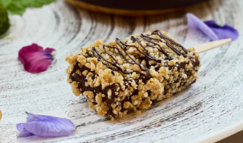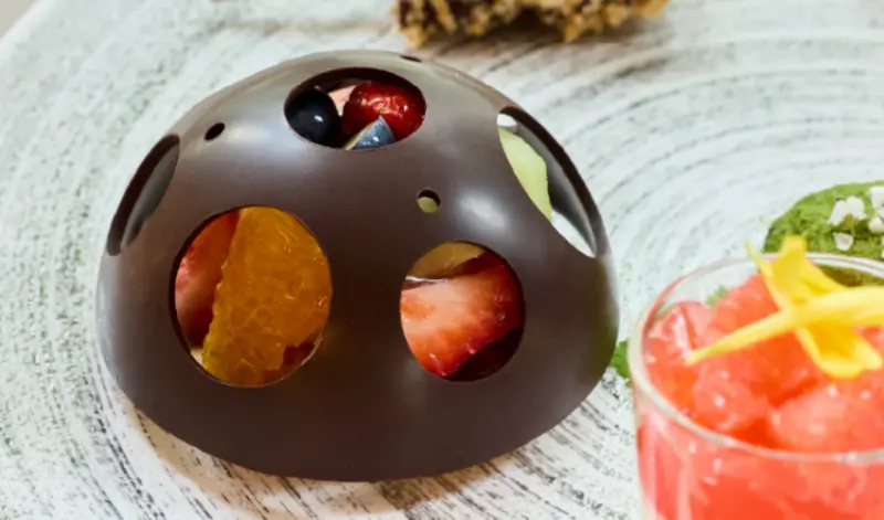 這款甜點特別體現了大阪飲食文化和環保理念的結合。飯店將客房贈送的大阪名產「岩脆」剩餘部分再利用,結合入口即化的生巧克力,以大阪著名的串料理形式呈現。一口咬下,生巧克力的口感將與岩脆的香脆風味交織。![]()