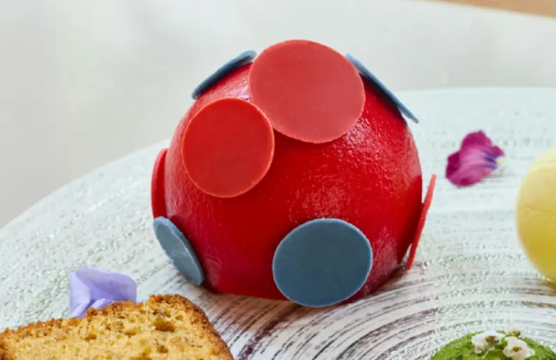 以芒果的濃郁香氣為基底,搭配紅醋栗的酸味點綴,再堆疊香草慕斯與覆盆子的鏡面釉,打造出彷彿吉祥物脈脈的外型,最後,頂部還有紅藍圓點的巧克力,這道端出來,一看就知道是啟發自萬博,絕對要拍照。![]()