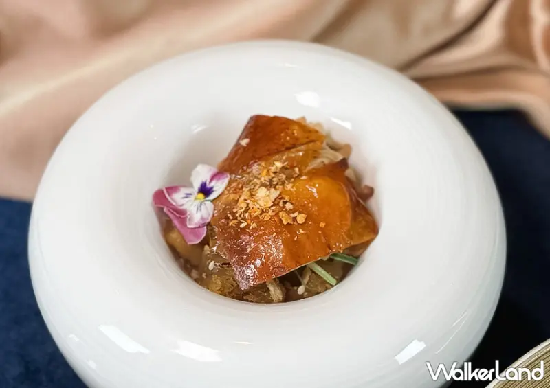 本次「粵宴」期間限定套餐,是鄺啟明與方永銘攜手創作的結晶,從湯品、主菜至港式點心,道道講究、層次分明。在主菜中,「禿油手拆蟹粉扒蟠龍紅條斑」以紅蟳蟹黃手工拆肉製蟹粉,與以紹興酒浸煮的石斑菲力,口感細緻鮮嫩。而「焗酥炸紅麴豬肋排佐泡菜」外酥內嫩、香氣四溢,佐以四川味泡菜,辣香酸爽,層次豐富。