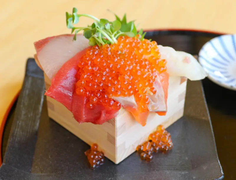「壽司左舷」憑藉其毗鄰大阪中央批發市場的絕佳地理位置,每天直接從市場採購最新鮮的海鮮,並於當日製成精緻壽司及豐盛海鮮。餐廳內還設有水族箱,顧客可欣賞師傅現場處理活魚的精湛表演。不可錯過的招牌料理就是附魚骨湯的海鮮左舷丼,將豐富海鮮豪邁地盛裝在方形木盒中,呈現出令人驚豔的視覺效果,同時完美展現了新鮮魚類的鮮甜風味。使用的食材包含但不限於鰤魚、鯛魚、鮪魚、鮭魚和鮭魚卵!是不是很豪華?