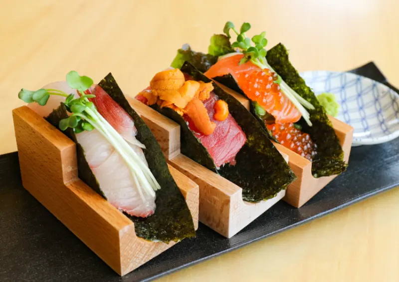 「手捲壽司」以三種組合套餐呈現海洋的恩賜。從清爽的赤身到濃郁的大脂鮪,或是融化口中的鮭魚、香氣四溢的鰻魚、口感絕佳的鯛魚組合,每一口都能體驗到食材與壽司飯交織出的奢華風味。套餐形式讓你能夠一次品嚐多種不同的口味!