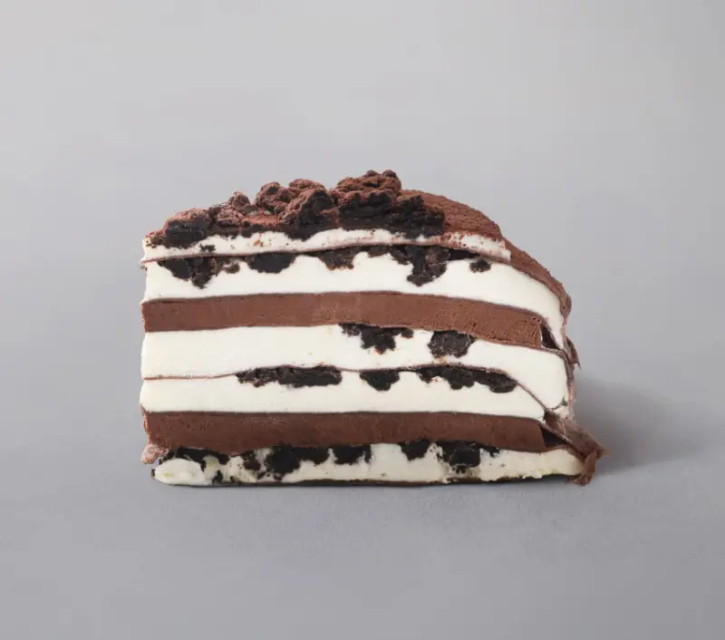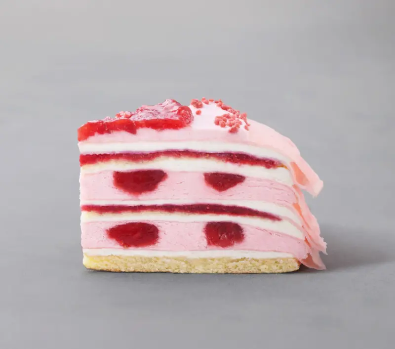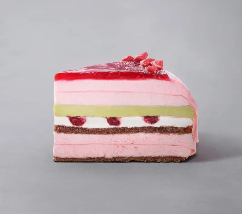 色彩繽紛的奶油、千層薄皮層層堆疊,覆盆子粉紅色、開心果淡綠色,以及北海道純生奶油的三種奶油層,再加上巧克力海綿蛋糕,一口咬下,絕妙的和諧口感立即在口中綻放。