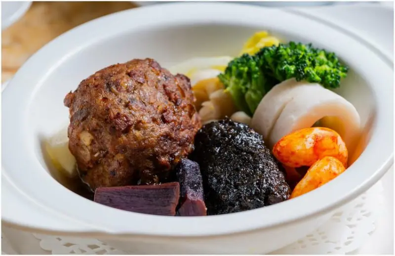以款待體貼著稱的喫茶趣,就怕有客人沒吃飽吃好!另一道為蔬食主義者打造的「紅玉素三杯獅子頭」同樣讓人驚豔,主廚用多項蔬食食材,以手工製作素獅子頭,以及黑木耳還原的素海參,不說真的被騙到!加上香氣與鍋氣逼人的台式熱炒經典代表 - 三杯調味,著實令人食指大動,難以相信這竟是一道無肉的純素食料理。畫龍點睛的還得是日月潭紅玉紅茶,淡雅的薄荷、肉桂和香氣,為濃郁的薑、麻油鋪墊出悠揚的餘韻,讓這道三杯料理華麗升級,吃過就回不去了!