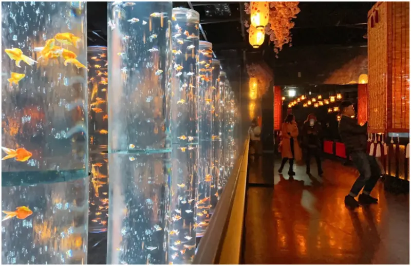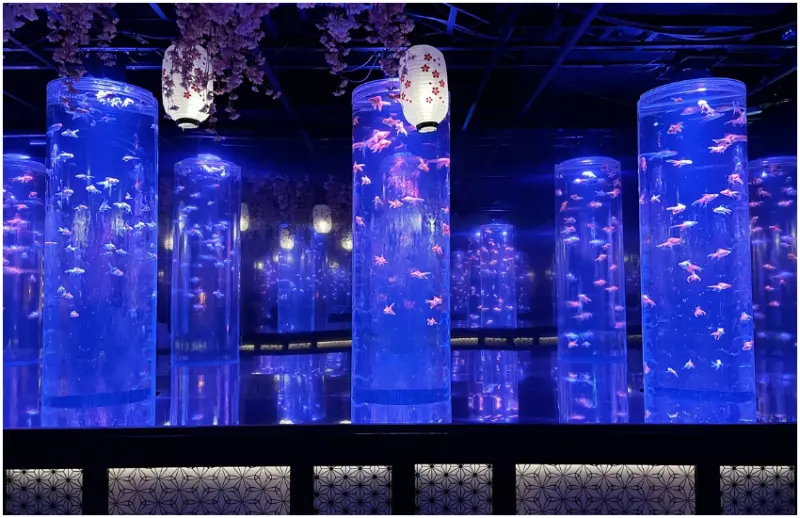 現在展出的,是春季限定的櫻花祭;夏季則有沁涼感十足的「納涼金魚祭」;秋天以紅葉為主題的「紅楓秋祭」;到了冬季,則是屬於夢幻氛圍的「聖誕彩燈金魚之夜」,每個季節都有專屬的燈光演出與展場裝置,讓每一次踏入這裡,都像參加一場只屬於當月、當刻的藝術祭典。