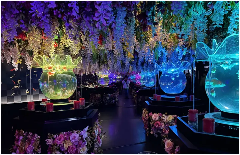 在一座鋪滿各式花卉的華麗空間中,燈光、音樂與水影緩緩引導視線,一缸缸金魚猶如水中之舞伶,在各自舞台中閃耀綻放。這裡不需要理解,只需要緩步而行、靜靜觀看,讓讚嘆自然浮現於心。![]()