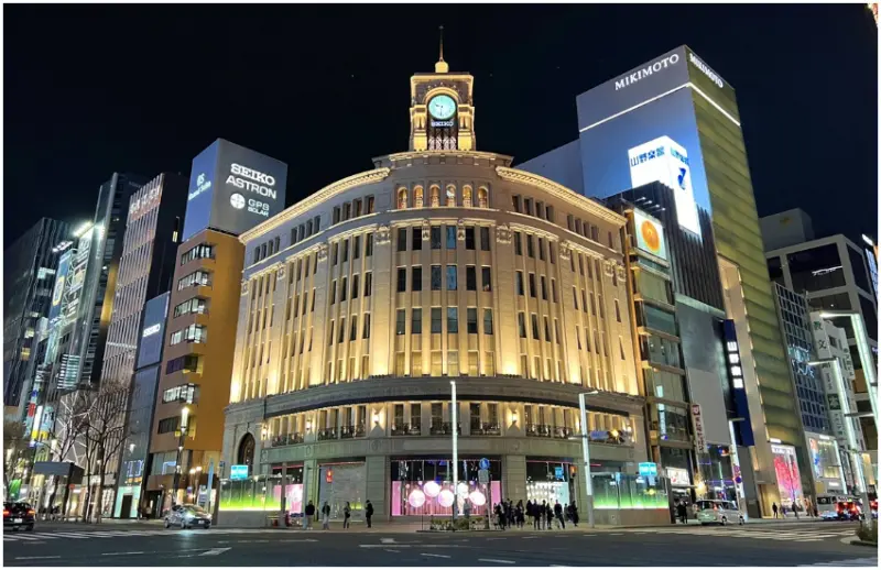 銀座中央通的兩側,分布著百貨、精品、老鋪、藝廊、茶屋、建築名作與星級餐廳,當銀座和光鐘樓的鐘聲響起,車輛滑過地面的聲響、行人的鞋底節奏,甚至購物袋與風衣摩擦的細碎聲音,都一起構成了這個街區的背景樂章。