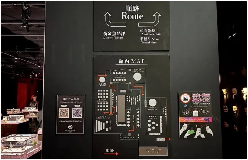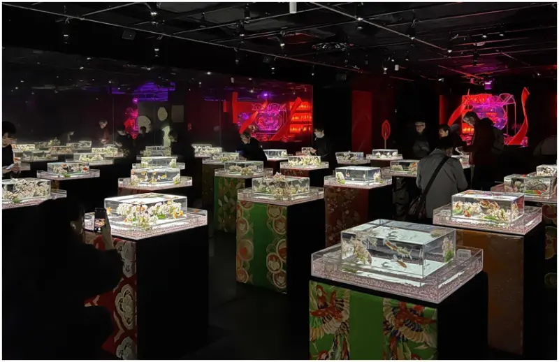 展館以黑色為基調,空間陳列融合日本傳統文化語彙與視覺裝置:浮世繪意象、障子窗、屏風、燈籠、摺紙、花卉與季節轉換皆成為佈展元素,層層堆疊出一座宛如夢境的金魚舞台,讓每一尾金魚的轉身,都成為永恆的藝術品。![]()