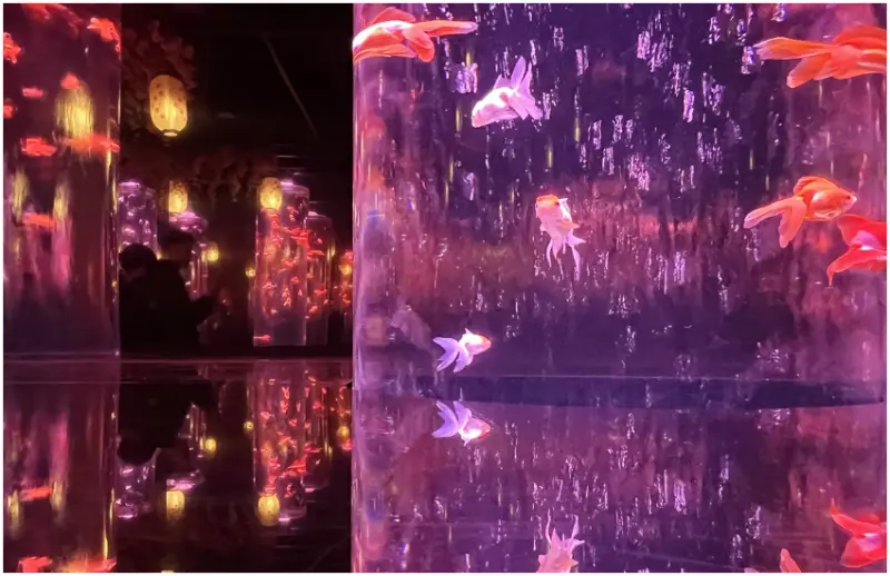 銀座金魚藝術水族館並非一般展示水中生物的水族館,更是一場以金魚為主角的沉浸式藝術表演,館內沒有其他海洋生物,僅展出上千尾不同品種的金魚,透過造型各異的藝術水缸、搭配燈光設計、環場音效、香氣裝置、鏡面投影與流水,打造多感官的場景轉換。