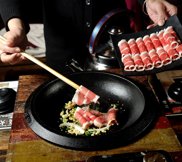 ●滿滿的石頭火鍋好澎派!石頭火鍋的作法也不像一般的火鍋,不是以涮為主,而以”炒”這方式進行。會在燒熱的石頭火鍋裡倒入油,爆香洋蔥蒜頭等香料提味,再加上醃製過的肉類爆炒後撈起,最後添加醬汁及高湯以及蔬菜配料,待湯滾後將爆炒過後的肉放入便可開始食用囉!