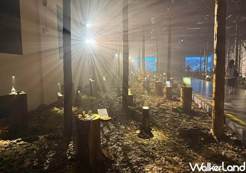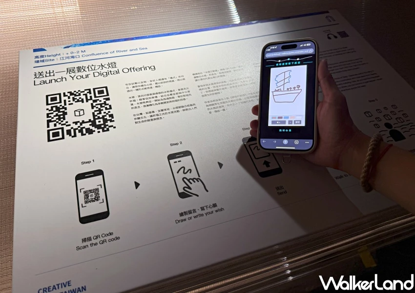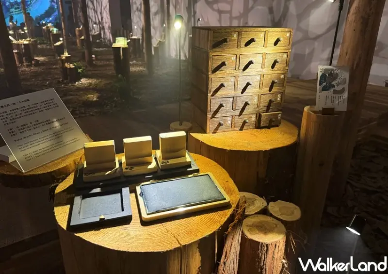 2025文博會松菸文化策展區最大亮點的4大主題館,分別在松菸2號倉庫到5號倉庫展出,最特別的便是2號倉庫「穿霧之境」,以林木、光線、煙霧打造出像身在煙霧籠罩的森林秘境中,林木間擺放各種小物,還能喝奉茶,展場中特別設置籤詩,可以拿到對應的集章卡,讓你逛展覽邊集章;3號倉庫「有河之靈」則展示與水有關的信仰文化,像是媽祖、與水災有關的台灣妖怪等,展區後方還有水燈祭典互動投影區,只要掃碼就能現場畫出自己的水燈,讓它漂浮在水幕上。![]()