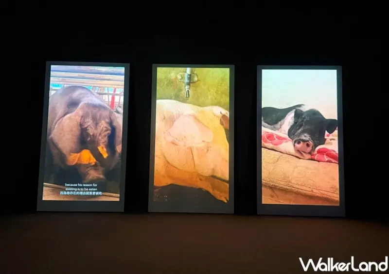 二樓展覽「環世界日誌」以「每個物種都有自己的世界觀」為主題,展出多位藝術家從貓咪、鯨豚、豬,甚至外星人的角度去感知世界;羅伃君的《三隻小豬》透過神豬、肉豬與寵物豬的視訊對話,以肉豬、神豬隨時間推移迎來被宰殺的命運,諷刺同樣是豬,卻因人類而有截然不同的命運;《與內在異星相遇》則運用 AI 機械學習技術,在現場視覺化屬於你的外星人模樣,具體呈現每個人心中對外星人的不同想像。![]()