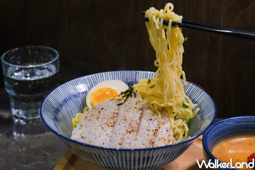 定置漁場三代目這次特別與「杜甲A-Ma」聯名推出「小川椒濃胡麻沾麵」,是台北店限定口味,以自製濃胡麻醬結合杜甲小川辣椒油,讓人吃得到鮮、香、麻、辣四重風味,搭配Q彈波浪麵、炙燒鬼頭刀魚片與糖心蛋,層次豐富並附上一碗魚白湯,讓拉麵控衝中山吃起來。![]()