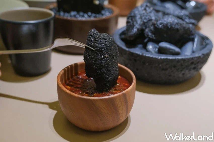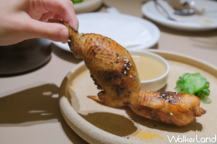 還有一道話題滿分的茄子蝦餅「Noir Surprise」,外觀模擬全黑玄武岩,是茄子與蝦漿炸製成酥脆黑亮的點心,也是復刻林熙元主廚在韓國餐廳裡的話題餐點。另一款「Hidden Feast」將泡菜炒飯藏進雞翅內裡,外酥內香再搭配起司醬,並且通過炙燒增添焦香味,讓人吃得超滿足。![]()