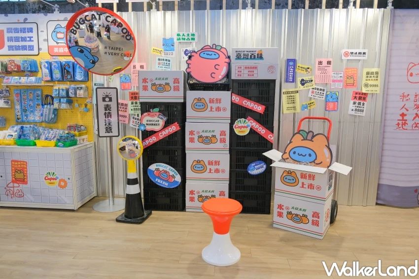 2025貓貓蟲咖波台灣百味快閃店台北站,在10/3至11/30在華山中5B館開市,現場拍照區還原台灣在地的市場氛圍,超在地「趕蒼蠅裝置」的肉攤、擺著進貨籃的水果攤,還有設置東泉辣椒醬的咖波小吃攤,以及寫著「倉庫前請勿停車」的街頭打卡點,一側還特別設置了公仔娃娃打卡區,讓粉絲們現買、現拍、現打卡。