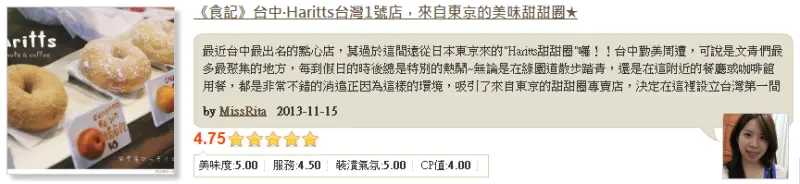 在日本東京起家,原本只是餐車的Haritts,因手作甜甜全風格深受附近上班族喜愛,漸漸地打響知名度!今年選擇在文青聚集地-台中勤美附近巷弄新開幕,吸引了許多人前往朝聖,就連平日上午也是大排長龍呢!多種甜甜圈口味輪流上陣,想吃到自己喜歡的口味,可是要靠運氣的呢!