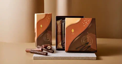 濕潤烘烤的千層派皮中,填入口感滑順的巧克力紅豆餡,以及大量巧克力鮮奶油。以巧克力色調統一設計的時尚限定包裝,燙金裝飾優雅閃耀。無論是犒賞自己還是送禮,都是這個季節才有的特別美味。