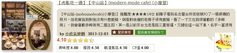 摘錄自小虎食夢網:問了問店名才知道modern mode好像是一個成立已久的品牌,專門經營古董、古董衣物、飾品、配件、珠寶,如今這家以老屋再結合「咖啡」搭上了「老屋咖啡」熱潮。