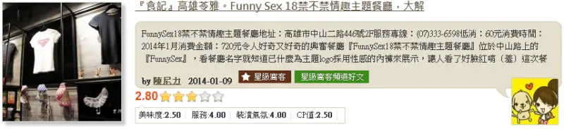 令人好奇又好奇的興奮餐廳『Funny Sex 18禁不禁情趣主題餐廳』,位於中山路上的『Funny Sex 』,看餐廳名字就知道已什麼為主題,logo採用性感的內褲來展示,讓人看了好臉紅唷(羞)