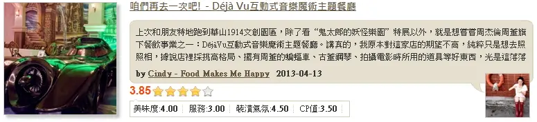據說店裡採挑高格局、擺有周董的蝙蝠車、古董鋼琴、拍攝電影時所用的道具等好東西,基本上整個地方為長形店面,走道的底端為樂團或是其它類型表演的舞臺,沒錯! Déjà Vu既然定位為互動式音樂魔術主題餐廳,現場演奏當然少不了!