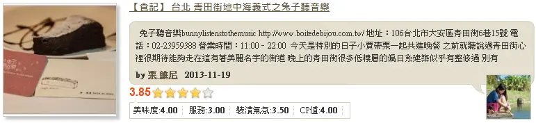 坐落在美麗青田街的兔子聽音樂適合情人或小貓兩三隻的聚會,夜晚坐在窗邊的餐桌,看著巷弄來往的人們,也是幅美麗的畫,當晚,也遇見了一位坐在窗邊角落的作家,上菜速度快,與吧台邊的服務生對到眼,會有微笑回應,店家很細心的裝飾餐廳,喜愛一起與酒共進晚餐的朋友,兔子聽音樂會是不錯的選擇。